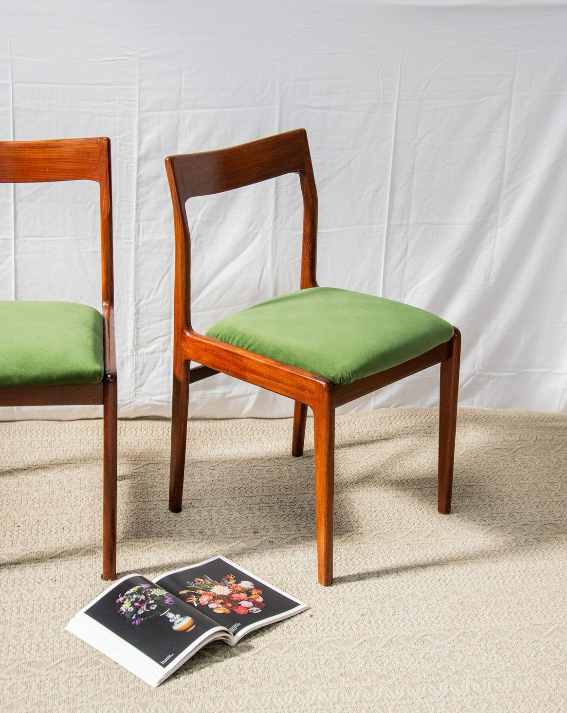 Découvrez cette élégante chaise en bois foncé brillant, en teck rouge, qui apporte une touche scandinave à votre intérieur. Son assise en tissu vert offre un confort optimal, tandis que les traces d'usures variables ajoutent un charme unique à chaque pièce. Idéale pour une décoration à la fois moderne et authentique, cette chaise s'intègre parfaitement dans n'importe quel espace de vie. Ajoutez une note chaleureuse à votre mobilier avec ce joli modèle au design intemporel. Vendue à l'unité, deux quantités sont disponibles.