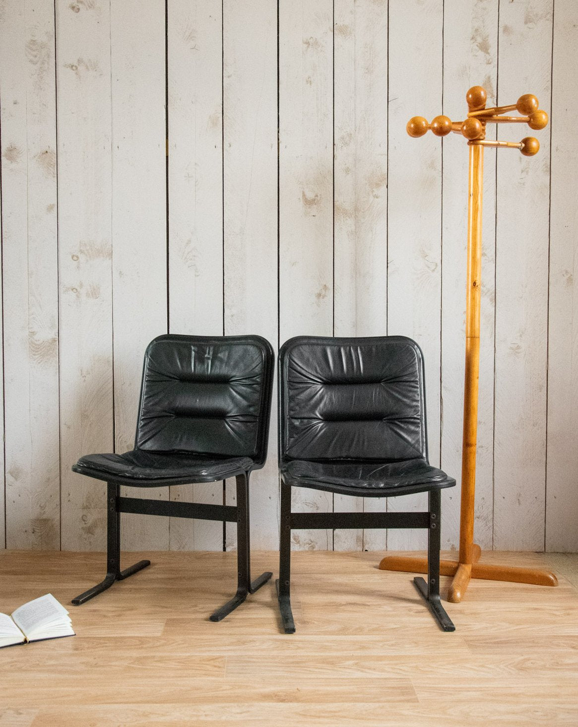 Adoptez cette paire de chaises italiennes des années 70 à structure métal et assise en cuir noir, où l'alliance du métal sombre et du cuir impeccablement conservé crée une allure élégante et raffinée. Leur silhouette légère et proportions mesurées s'intègrent autour d'une table de repas, dans un bureau ou un coin salon, apportant une touche vintage maîtrisée. Le cuir offre un confort immédiat tandis que le métal garantit solidité et caractère. Usure de la peinture et pieds patinés naturellement.