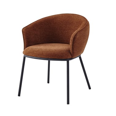 ALVIN, un fauteuil de table tout en rondeur dans esprit contemporain chic et sobre !On aime le galbe affirmée de son assise monobloc rembourrée de 7 cm de mousse haute-résilience (26 kg/m3) qui invite aux longs repas entre amis, confortablement assis.Son revêtement premium en tissu Luxury Terracotta, labellisé Oeko-Tex, lui confère un look très tendance avec le détail du passe-poil qui vient souligner les courbes du dossier.La structure est en métal noir ""full mat"", tubes en 22 mm de section.On pourra composer un ensemble autour d'une table, ou l'intégrer dans un esprit nomade dans un séjour, une chambre ou en fauteuil de bureau.Nul doute, un incourtournable !