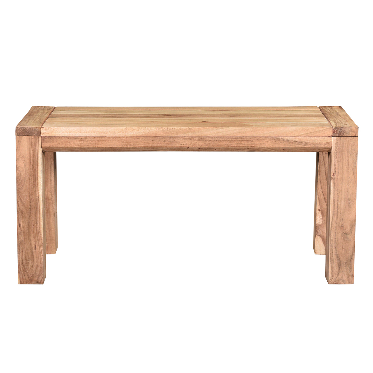 Ce banc d'intérieur met à l'honneur l' acacia massif avec splendeur. Essence de bois exotique aux reflets dorés, il laisse apparaître ici ses nervures et ses noeuds tout en beauté. Cette matière naturelle est mise en valeur par un design brut , venant souliger le caractère authentique de ce banc. Plébiscitée pour la confection de mobilier d'intérieur, l'acacia est une essence naturellement dure et dense particulièrement esthétique. Ce bois imputrescible, se distingue par ses veinures allongées, mais également ses variations de couleurs. Avec le temps, l'exposition à la lumière et sources de chaleur, l'acacia est un bois clair dont le coloris jaune-vert à doré subit une coloration naturelle (brune, rougeoyante, reflets gris). Ce meuble en bois d'acacia est traité avec une finition laque incolore.