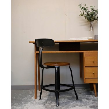 Adoptez cette chaise d'atelier au charme industriel, reconnaissable à son dossier baleine qui dessine une silhouette graphique et enveloppante. Son piétement en métal garantit une assise stable tandis que l'assise en bois apporte une chaleur tactile et un contraste de matières harmonieux. De proportions adaptées à un bureau ou une table, elle invite à s'asseoir pour travailler ou partager un repas convivial. Élégante et sobre, elle s'intègre facilement dans une décoration contemporaine ou atelier.
