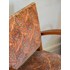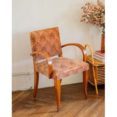 Adoptez cette chaise au piètement en bois clair délicatement veinuré, habillée d'un tissu de style persan aux nuances bordeaux, orangé et marron qui apporte chaleur et caractère. Ses proportions équilibrées et son assise accueillante en font une pièce versatile pour une salle à manger ou un coin lecture, conjuguant confort et élégance rétro. La solidité du bois souligne son usage quotidien tout en sublimant une ambiance chaleureuse et raffinée. Légères marques sur le tissu et le bois.