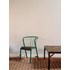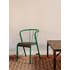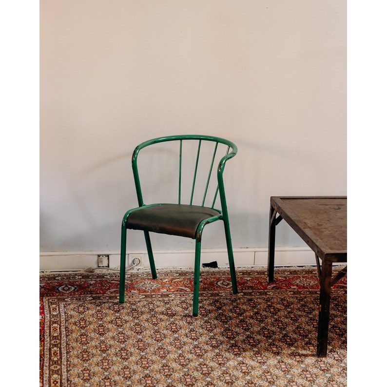 Adoptez cette chaise industrielle verte au charme d'atelier, non signée, dont la structure en tôle et tube d'acier cintré et l'assise en skai offrent robustesse et un confort discret. Le dossier incurvé ajouré, avec ses montants verticaux et le petit accoudoir asymétrique, rappelle le mobilier français des années 1940–1950 et s'intègre naturellement dans un coin bistrot ou un bureau compact. Sa peinture verte d'origine affiche une belle patine d'usage qui lui confère chaleur et authenticité. Quelques marques d'usage qui font son authenticité.