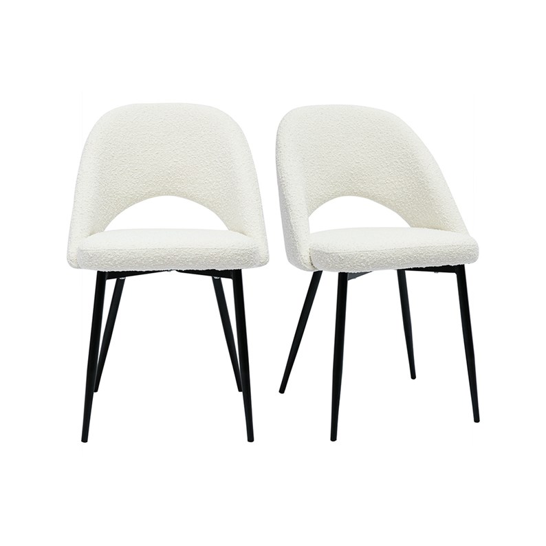 Ces assises au charme subtilement rétro sont synonymes de convivialité et de partage. Leur tissu effet laine bouclée (100% polyester) se décline dans un coloris blanc élégant et intemporel. Les pieds fuselés en métal noir apportent de la légèreté à la silhouette et s'accordent aisément avec tous les styles de tables à manger .