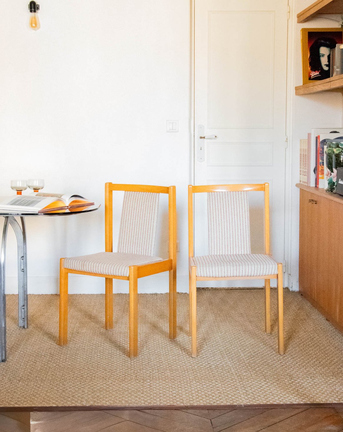Adoptez cette paire de chaises en bois clair, habillée d'un tissu rayé en laine qui apporte chaleur et texture à votre intérieur. Le dossier et l'assise profilés offrent un confort posé, tandis que les quatre pieds droits garantissent stabilité et lignes graphiques ; leurs proportions compactes s'intègrent facilement autour d'une table ou dans un coin lecture. Idéales pour un décor scandinave ou contemporain, elles distillent une ambiance sobre et accueillante. Traces d'usage présentes.