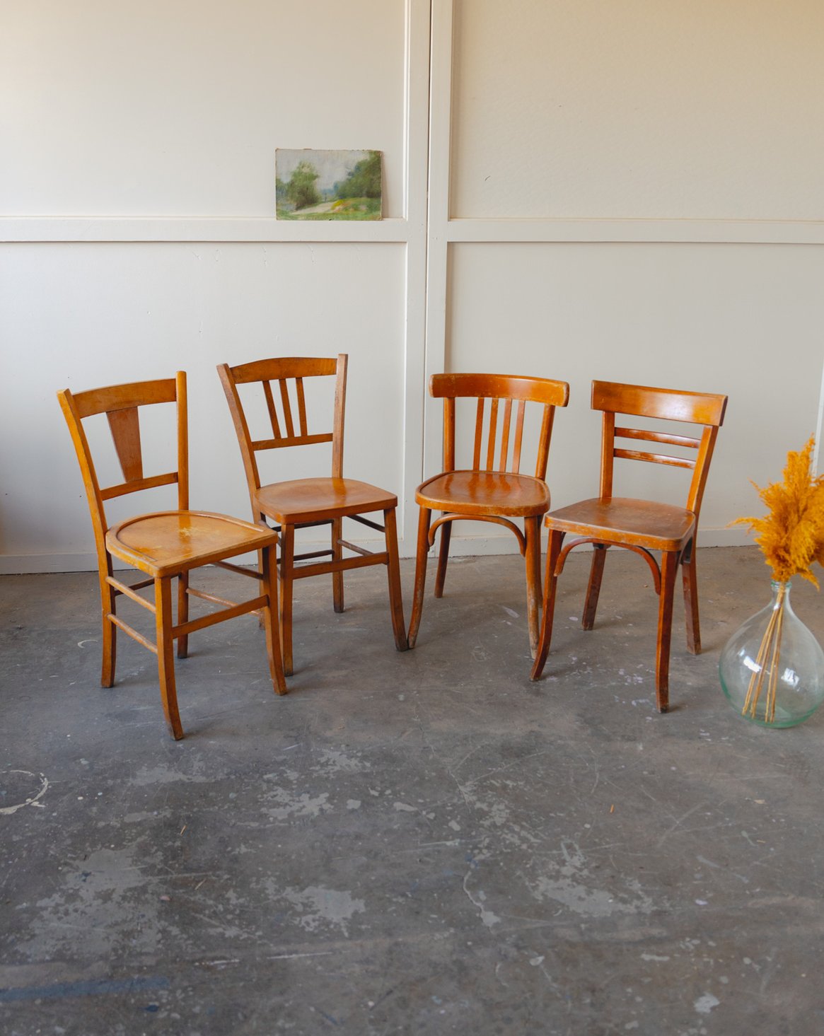 Découvrez ce lot de quatre chaises de bistrot dépareillées en bois clair, au charme chaleureux et aux lignes simples qui s'intègrent facilement à une cuisine, une salle à manger ou un coin café. Le bois clair et la patine naturelle issue de leur histoire apportent une touche authentique et lumineuse, tandis que leurs proportions compactes conviennent aux espaces intimes comme aux tables étroites. Mélangeant texture et confort, elles créent une atmosphère conviviale et vintage, idéale pour des repas détendus ou un coin déco. Traces du temps présentes.
