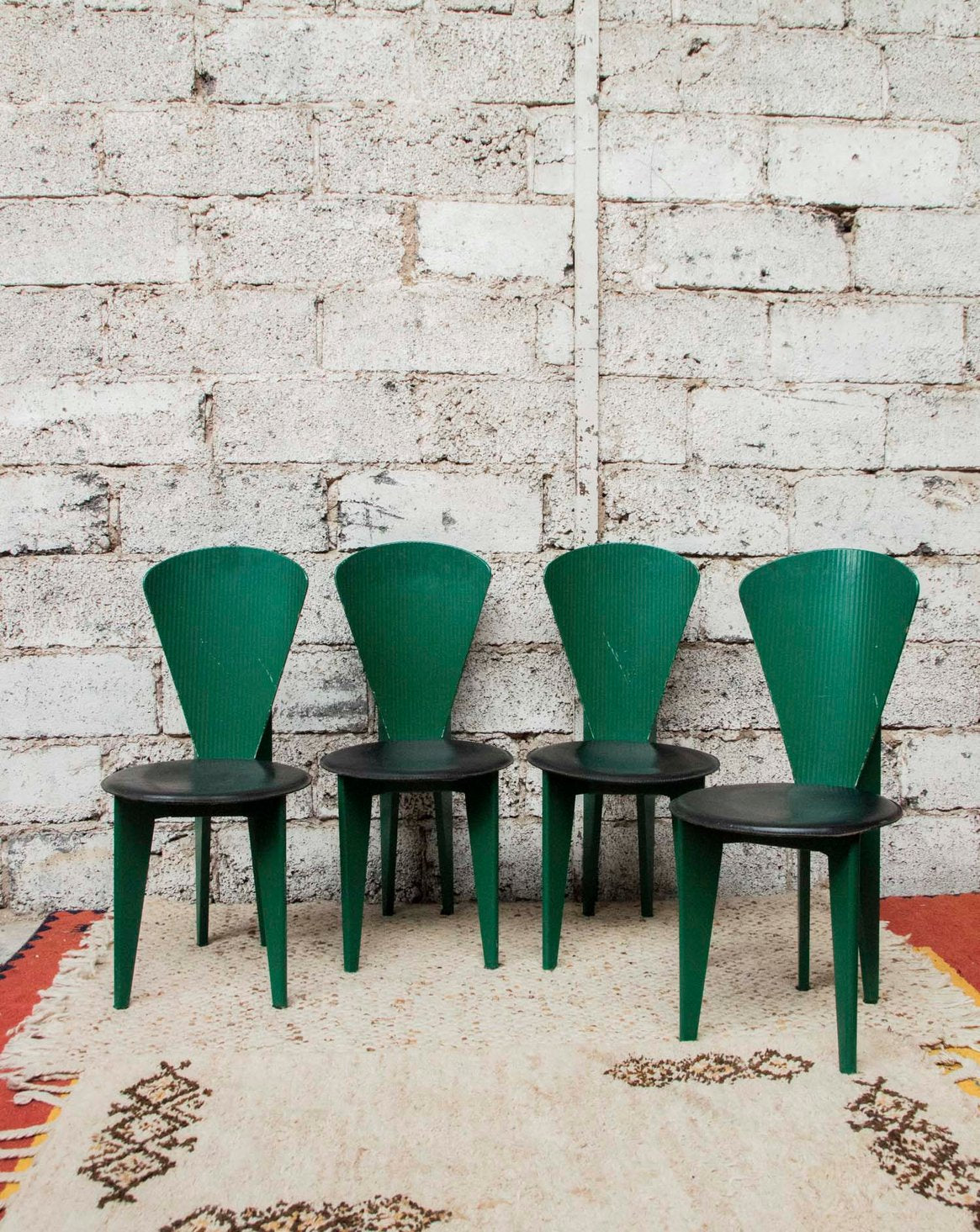 Ajoutez une touche d'élégance italienne à votre intérieur avec cette série de 4 chaises au design moderne. Arborant un élégant revêtement vert associé à une assise en simili noir, ces chaises garantissent à la fois style et confort. Leur grand dossier triangulaire offre un soutien optimal tout en mettant en valeur l'esthétique contemporaine de votre espace. Parfaites pour un dîner entre amis ou un moment de détente, ces chaises sont l'allié idéal de votre mobilier. Usures légères.