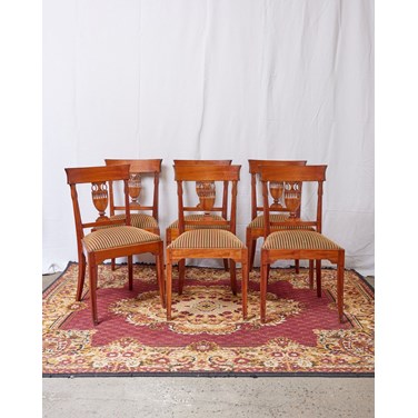 Adoptez ce lot de six chaises style Empire aux lignes classiques et proportions élégantes, idéal pour structurer un coin repas ou une salle de réception. Les assises en soie à rayures, clipsables, permettent confort et un entretien facile au pressing. Parfaites pour une salle à manger formelle ou un salon d'apparat, elles instaurent une atmosphère chaleureuse et intemporelle, tout en restant pratiques au quotidien. La monture sobre s'accorde à différents décors, du classique au contemporain.