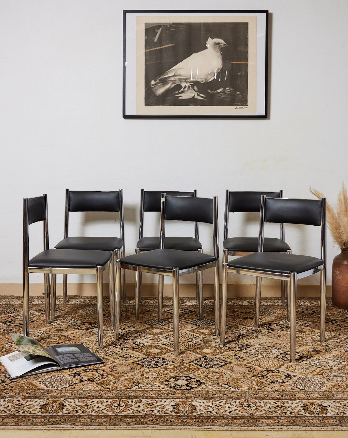 Adoptez ce lot de six chaises en chrome et simili cuir noir, où la structure métallique brillante dialogue avec l'assise sobre pour une silhouette contemporaine et élégante. Conçues pour accueillir confortablement vos repas et réunions, elles s'intègrent aussi bien à une salle à manger moderne qu'à un espace professionnel recherchant sobriété et fonctionnalité. Le simili cuir offre une assise facile d'entretien et un toucher soigné, tandis que le cadre chromé assure solidité et légèreté visuelle, créant une atmosphère raffinée et accueillante.
