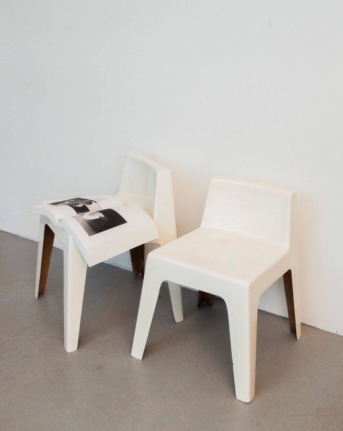Adoptez ce lot de deux chaises Kostka en fibre de verre blanche des années 70, au design sculptural qui conjugue légèreté et caractère. Leur silhouette épurée apporte une allure rétro et contemporaine, parfaite autour d'une table compacte ou comme assise d'appoint dans un coin bureau. Empilables pour un gain de place discret, elles s'intègrent aussi bien dans un intérieur minimaliste que dans un espace café au charme vintage. Vendues uniquement en paire, elles gardent le témoignage de leur histoire. Quelques marques d'usage qui font leur authenticité.