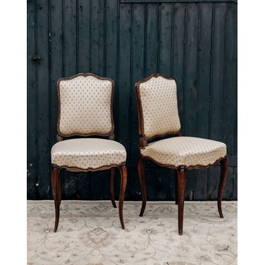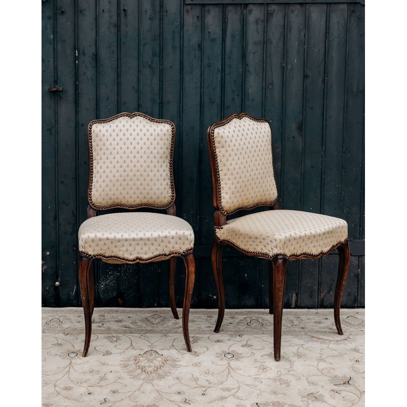 Adoptez cette paire de chaises en bois foncé au galbe élégant, où le bois incurvé dessine une silhouette raffinée. Les assises et les dossiers, habillés d'un tissu en très bon état ponctué de petites fleurs brodées, apportent une touche délicate et tactile, idéale pour une salle à manger intime ou un coin lecture cocooning. Leurs proportions équilibrées offrent un confort d'assise soigné tout en restant faciles à intégrer dans des intérieurs contemporains ou classiques.