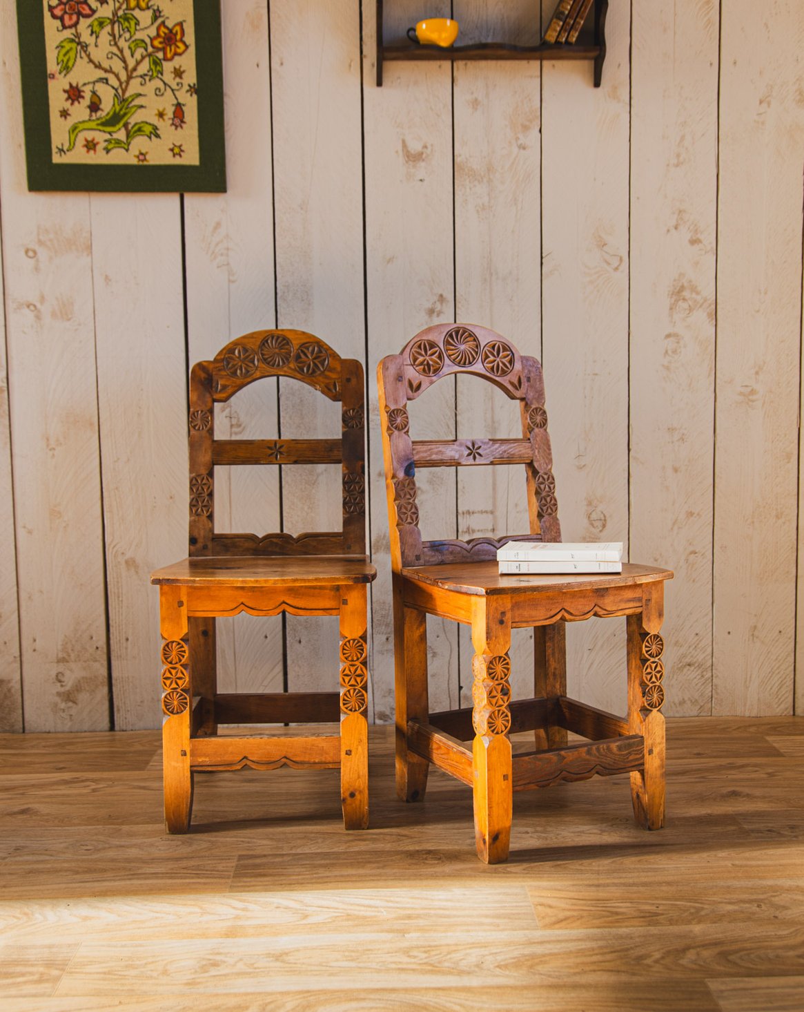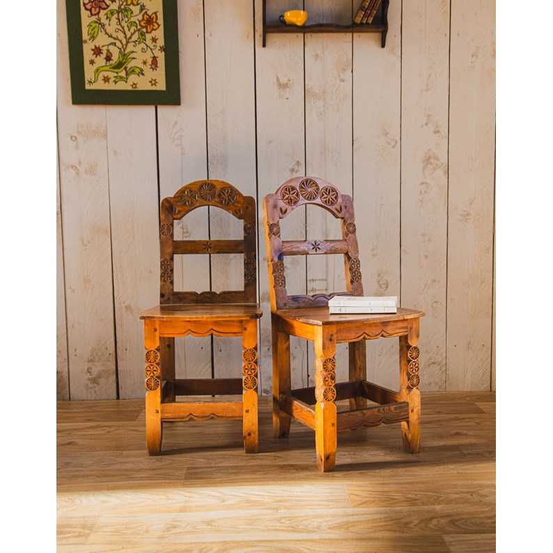Invitez une paire de chaises tout en bois au design graphique, ornées de dessins géométriques taillés dans leur corps qui apportent une personnalité sculpturale à votre intérieur. Leur structure en bois solide offre une assise stable et chaleureuse, parfaite pour une salle à manger, un coin bureau ou une entrée au charme artisanal. La silhouette épurée dialogue autant avec un décor contemporain que vintage, créant une atmosphère conviviale et élégante. Légères traces du temps présentes.