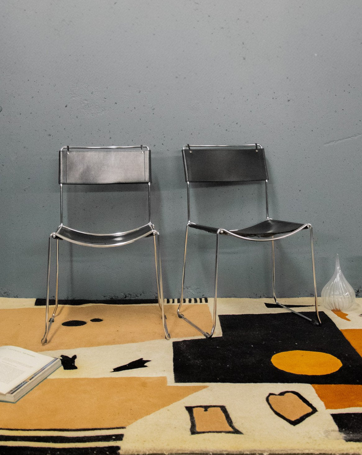 Adoptez cette paire de chaises italiennes des années 1980, alliant une base en chrome et une assise et un dossier en cuir noir pour un style graphique et raffiné. Leur silhouette élancée et l'assise accueillante s'adaptent aussi bien à une salle à manger qu'à un bureau, apportant une atmosphère rétro contemporaine à votre intérieur. Les matériaux soulignent une esthétique authentique et facile à vivre, malgré des signes d'âge visibles sur le cuir et la structure. Le cuir est notamment abîmé sur le dessous de l'assise. Vendues à paire, 3 quantités sont disponibles.