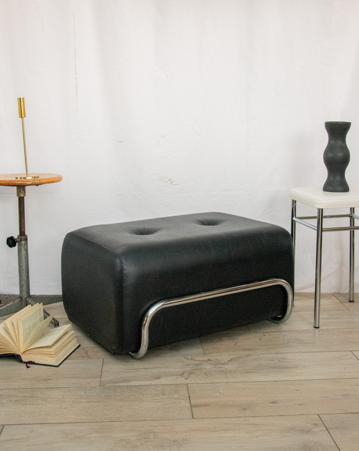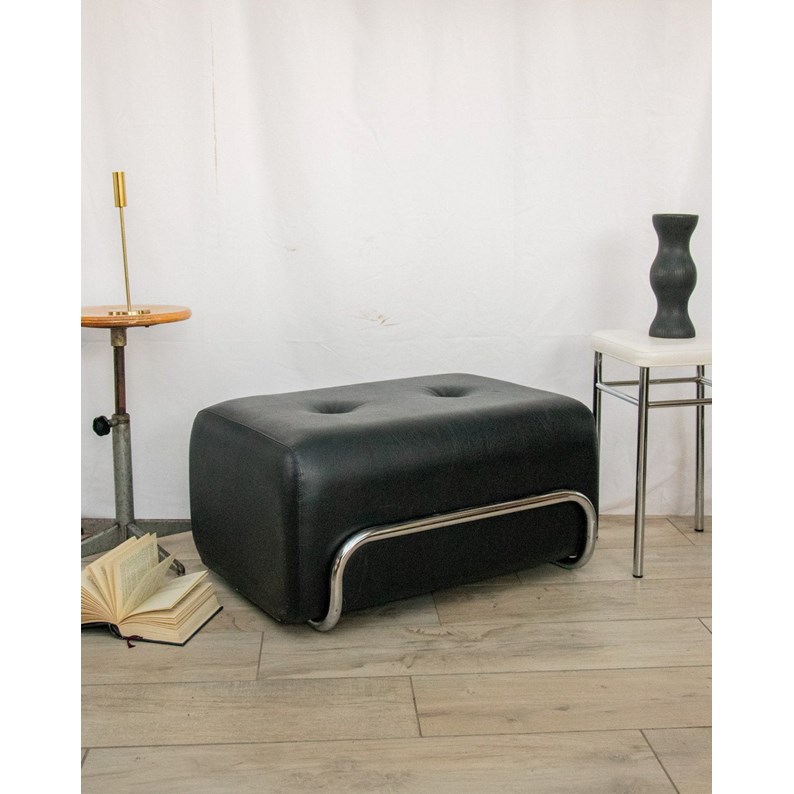 Adoptez un pouf en simili cuir noir au piètement chromé, en excellent état, dont la ligne sobre et contemporaine apporte une note élégante à un salon, un bureau ou une chambre. Conçu pour servir d'assise d'appoint ou de repose-pieds en bout de canapé, il marie l'allure lisse du simili cuir à l'éclat du chrome pour une présence discrète mais structurée dans la pièce. Le piètement amovible permet de le poser directement au sol ou de le fixer selon votre style et vos besoins.
