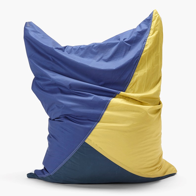 Bâche de chapiteau (dos blanc) : Passées les années de lendemain de fêtes, les bâches de chapiteau viennent prendre leur retraite sous les poufs.