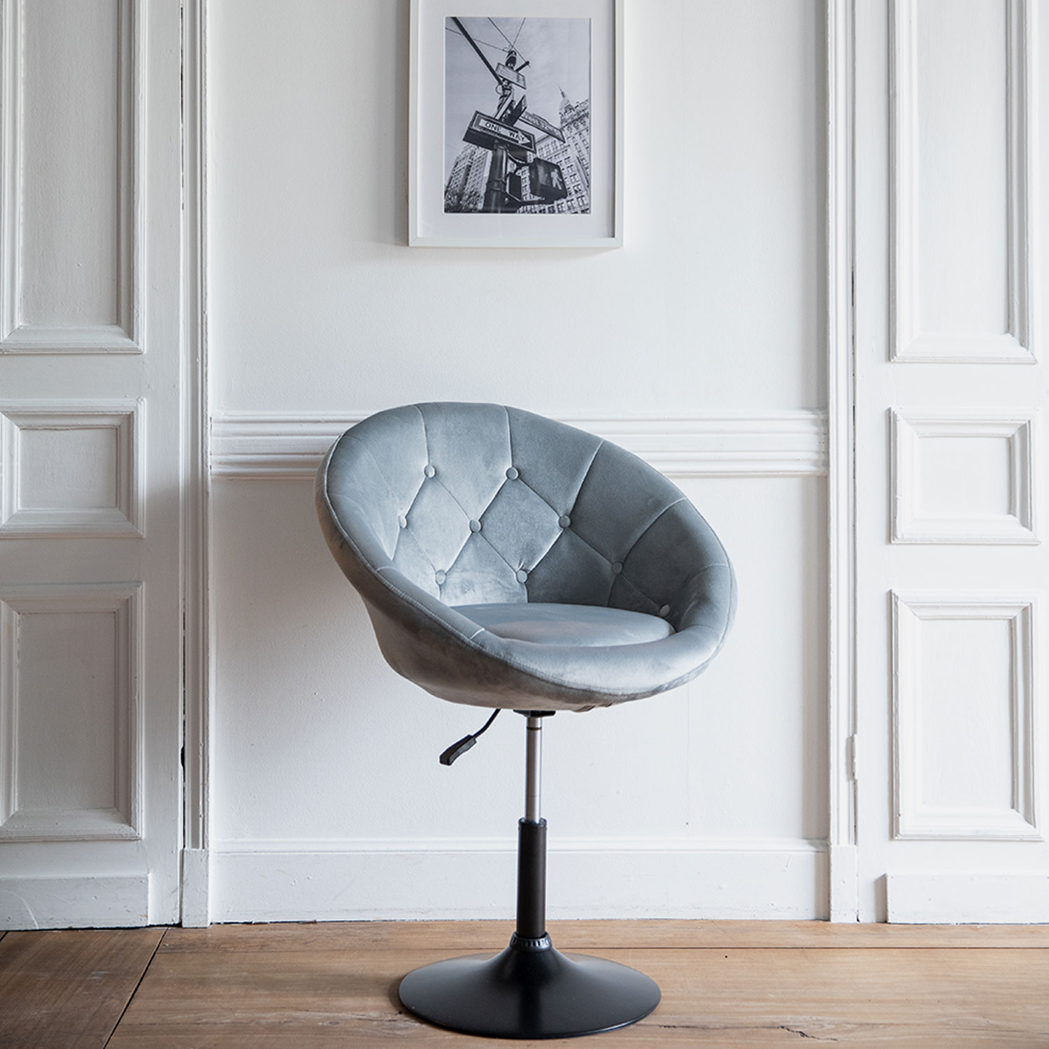 Avec le tabouret en velours style vintage modèle EDGAR proposé par Happy Garden, vous ajouterez une touche chic à votre décoration d'intérieur. Celui-ci pourra aisément aménager un meuble bar ou une table à manger puisqu'il se règle en hauteur pour s'adapter à toutes les situations. Il comporte un revêtement capitonné, un coussin d'assise confortable, des accoudoirs, un pied en métal et une base ronde noire stable.