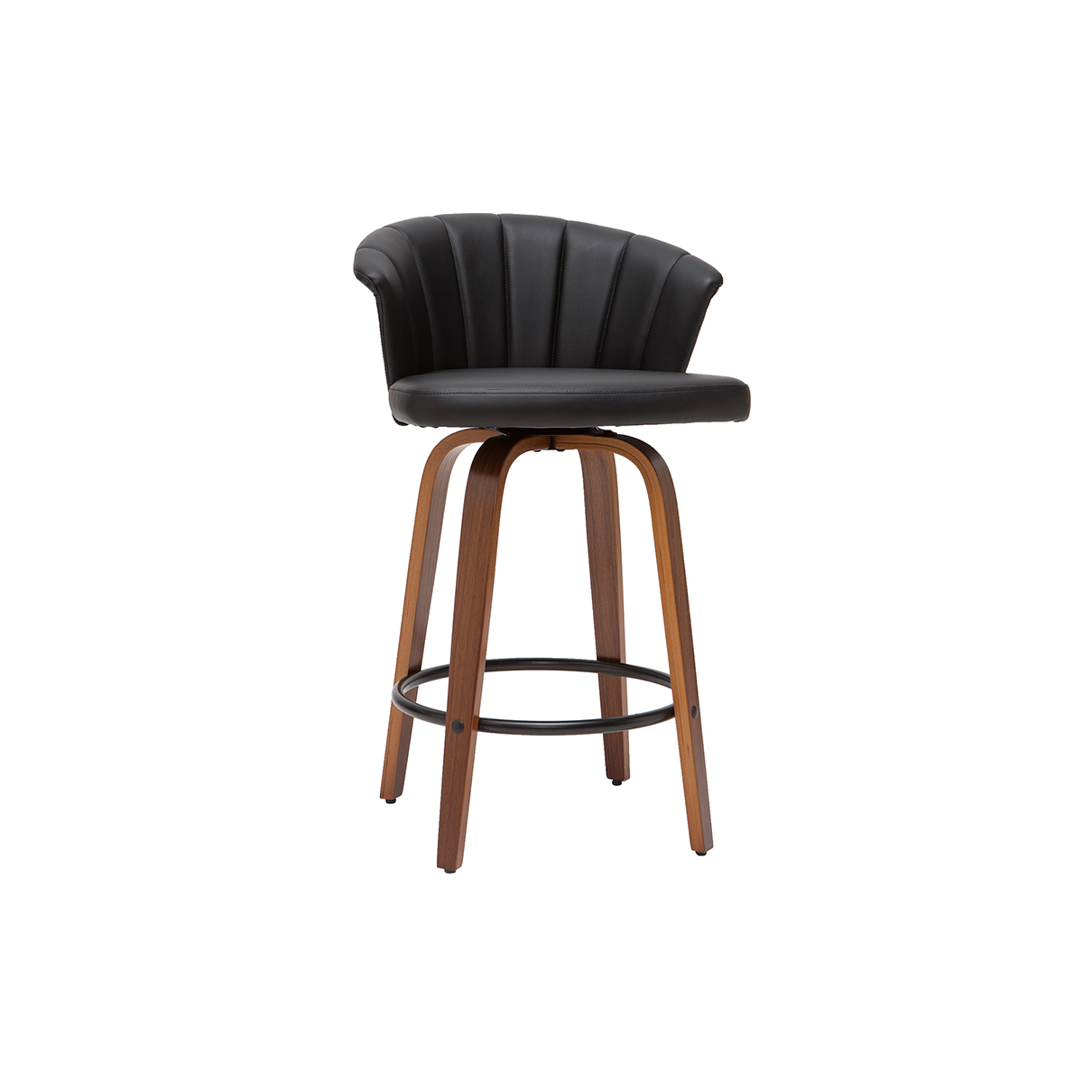 Avec ses courbes enveloppantes, ce tabouret de bar présente un joli travail sur la matière. L'élégante structure courbée en contreplaqué noyer dessine des lignes fluides et élégantes. On aime particulièrement la finition authentique offerte par le placage en noyer. L'assise a quant-à-elle été travaillée avec un revêtement capitonné noir sophistiqué et très facile d'entretien.