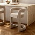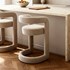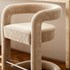 Tabouret de bar en tissu écru au design enveloppant. Doté d'une assise confortable, d'un dossier arrondi avec accoudoirs intégrés et d'un repose-pieds en métal, il combine élégance contemporaine et confort.