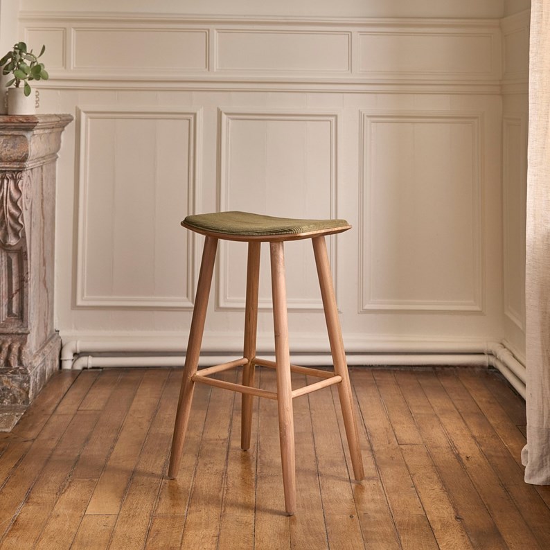 Tabouret de bar en teck avec une assise en velours côtelé kaki, idéal pour une cuisine moderne. Ce modèle rehausse votre espace avec sa texture unique et son design épuré. Caractéristiques : Matière : Teck - Couleur : Naturel – Hauteur : 77 cm – Largeur assise : 48 cm – Profondeur assise : 35 cm - Hauteur assise : 75 cm - Poids : 5 kg - Garantie : 5 ans - Montage : Livré monté.