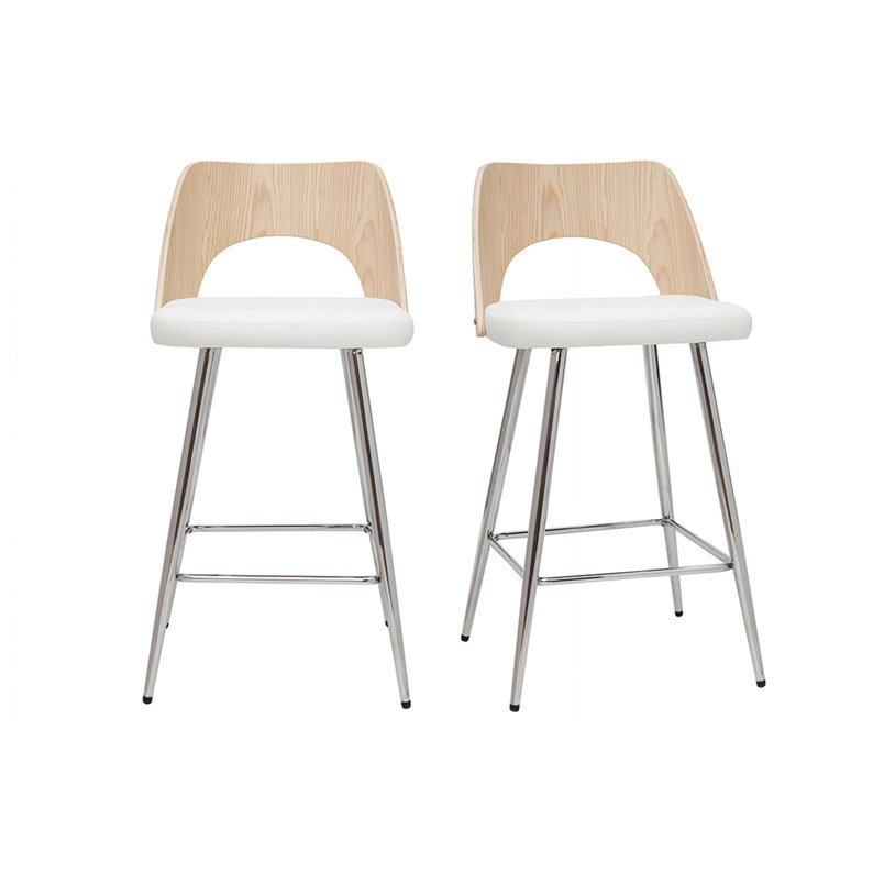 Épurés et authentiques, fonctionnels et élégants, ces tabourets de bar fixes (H66.5 cm) équilibrent couleurs et matières pour un résultat des plus design. Silhouette contemporaine et détails à l'inspiration nordique se partagent la vedette pour sublimer vos cuisines ou salles à manger. Si le revêtement blanc en polyuréthane et le piètement métal chromé se veulent résolument modernes, l'ensemble voit ses lignes adoucies par le dossier en placage chêne . Le bois clair apportera une note chaleureuse à votre intérieur, et votre coin repas n'en sera que plus tendance !