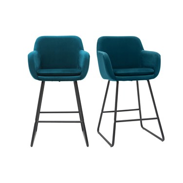 Chaises de bar en velours bleu pétrole vendues par lot de 2 et livrées prêtes à assembler.