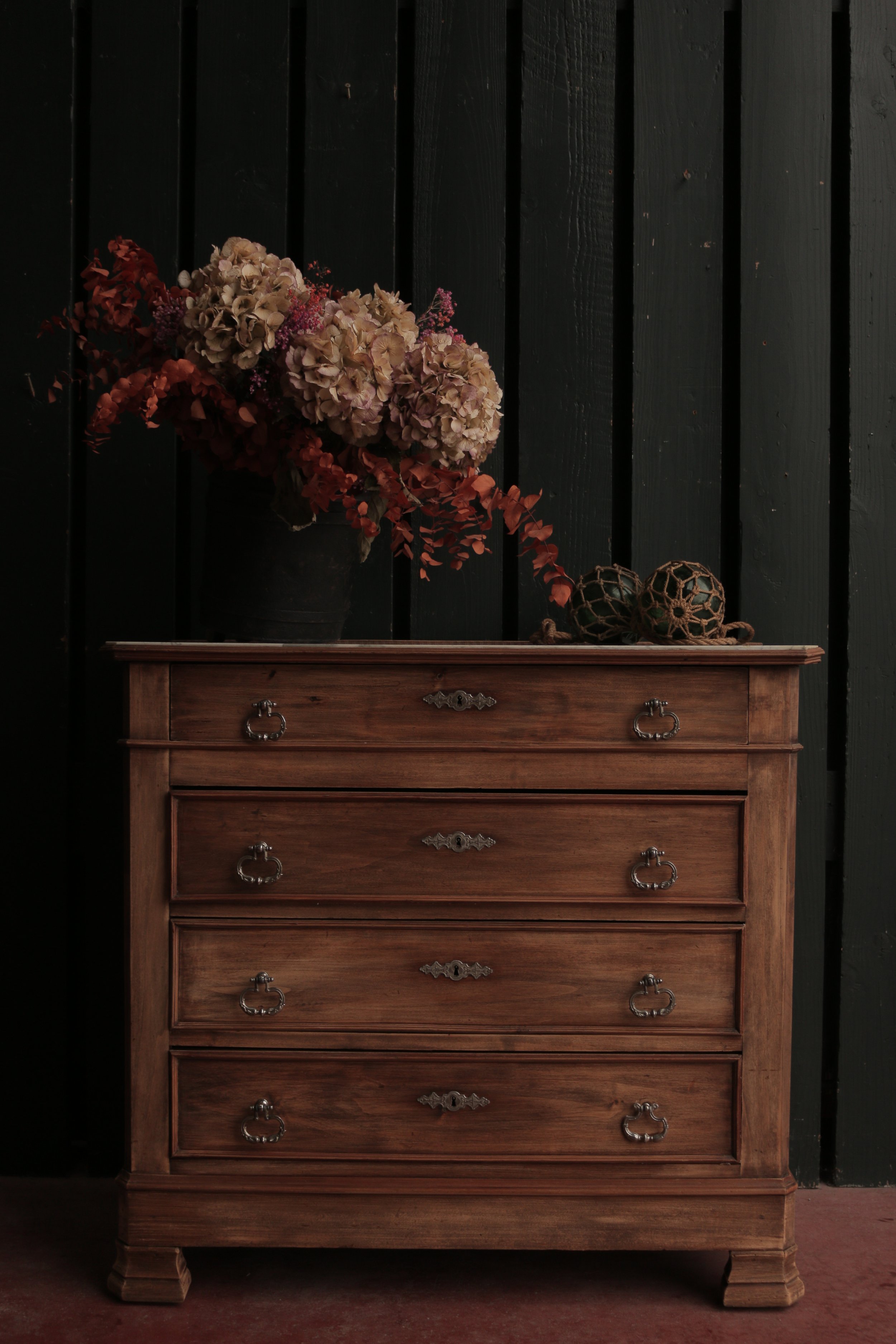 Dotée de plusieurs tiroirs aux poignées et ornements métalliques travaillés, elle offre un vaste espace de rangement tout en étant un véritable élément décoratif. Dans une chambre, elle accueillera linge et accessoires ; dans un salon ou une entrée, elle apportera du cachet tout en offrant un espace pratique pour exposer lampes, cadres ou bouquets de fleurs séchées.