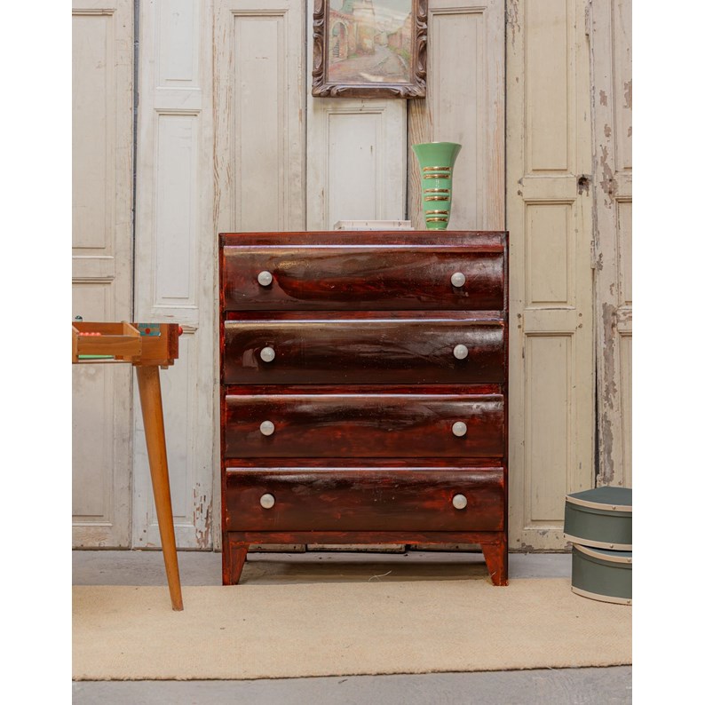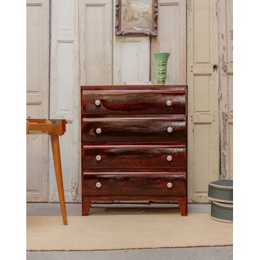 Adoptez cette commode des années 50 à la peinture d'origine, habillée d'un acajou chaleureux qui souligne ses lignes rétro et élégantes. Son gabarit offre un beau volume de rangement discret, avec ses 4 tiroirs, idéale pour une chambre ou une entrée, et les boutons en aluminium apportent une touche graphique et contemporaine. Sa patine naturelle révèle une histoire douce et s'intègre dans une ambiance sobre et raffinée. Légères traces du temps présentes.