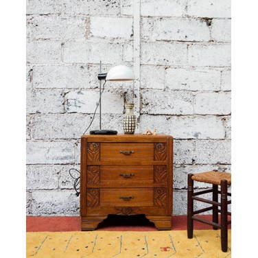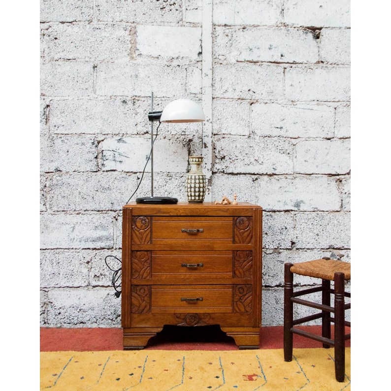 Sublimez votre intérieur avec cette petite commode Art déco en bois aux lignes graphiques et à la patine chaleureuse, rehaussée de dessins sculptés qui lui donnent du caractère. Ses trois tiroirs offrent un rangement fonctionnel et discret pour une chambre ou une entrée, tandis que les poignées métal soulignent le contraste des matières. Ses proportions compactes la rendent idéale pour les espaces réduits, et ses pieds larges mais effilés apportent stabilité et élégance.