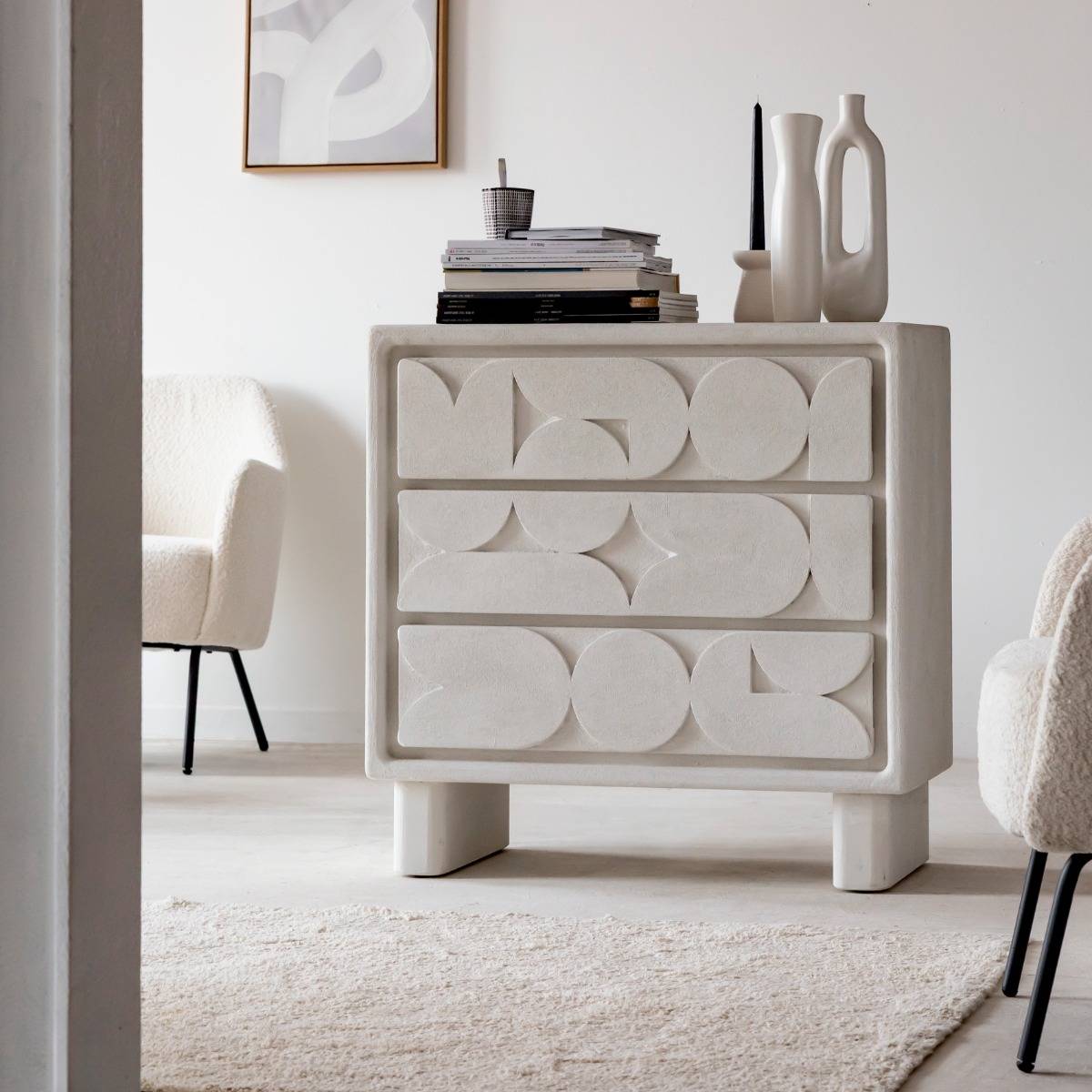 Commode 3 tiroirs en polyrésine blanche à façade sculptée. Design graphique, belle capacité de rangement. Une pièce design de la collection Danaé.
