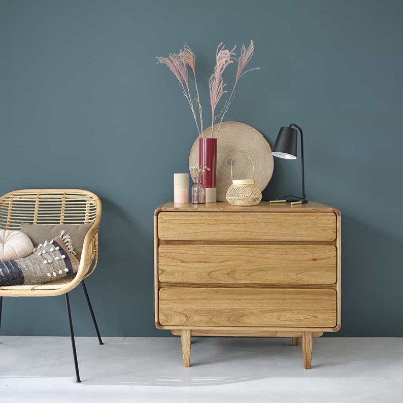 En bois de mindy, cette commode vintage dispose de 3 grands tiroirs. Sa petite taille vous permet de la disposer dans toutes les pièces de votre intérieur. Caractéristiques : Matière : mindy - Couleur : naturel - Hauteur : 80 cm - Longueur : 90 cm - Profondeur : 50 cm - Largeur tiroirs 86 cm - Hauteur tiroir haut : 11 cm - Hauteur tiroir milieu : 18 cm - Hauteur tiroir bas : 18 cm- Poids : 29 kg - Garantie : 5 ans - Montage : Oui. Les + : bois massif – 3 tiroirs.