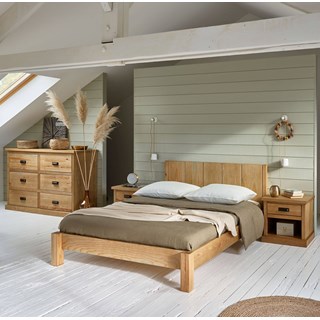 Le bois massif et le placage de pin brossé lui confèrent une grande robustesse ainsi qu'un charme rustique, aux inspirations nordiques, contrasté par des lignes sobres et élégantes. On adore son effet ""planches de bois juxtaposées"" sur la tête de lit !