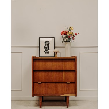 Adoptez cette commode scandinave en teck, aux lignes épurées et à la teinte chaleureuse qui apporte une élégance naturelle à la pièce. Ses trois tiroirs offrent un rangement organisé et profond, idéal pour le linge ou les accessoires, tandis que ses proportions équilibrées s'intègrent autant dans une chambre que dans une entrée ou un salon. Le bois de teck, patiné, diffuse une ambiance douce et accueillante. Son design sobre invite à une décoration contemporaine et apaisée.