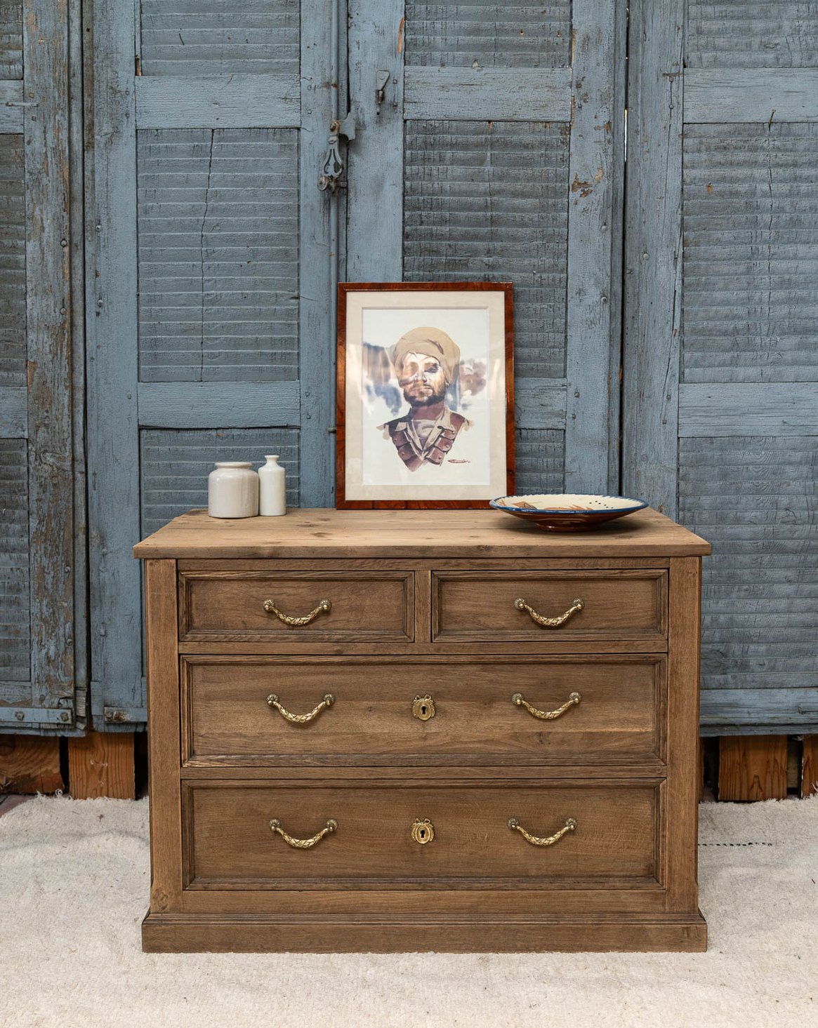 Découvrez cette commode vintage en chêne à l'état brut, un véritable clin d'œil au charme intemporel. Dotée de deux petits tiroirs et de deux grands tiroirs, elle offre un espace de rangement pratique tout en préservant une esthétique authentique. Les poignées en bronze ajoutent une touche d'élégance, mettant en valeur le caractère unique de ce meuble. Parfaite pour compléter votre intérieur avec style, cette commode allie fonctionnalité et design.