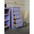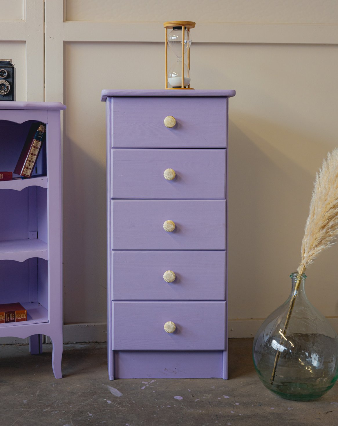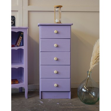 Ajoutez ce petit chiffonier en pin, relooké d'une peinture violet clair qui apporte une note douce et contemporaine à la pièce. Sa silhouette haute et étroite offre cinq tiroirs pratiques, parfaits pour optimiser un coin chambre, entrée ou dressing sans encombrer l'espace. Les boutons en résine blanche ponctuent l'ensemble d'une touche moderne et légère, tandis que le bois laisse transparaître une chaleur naturelle. Idéal pour ranger linge ou accessoires et instaurer une ambiance sereine.