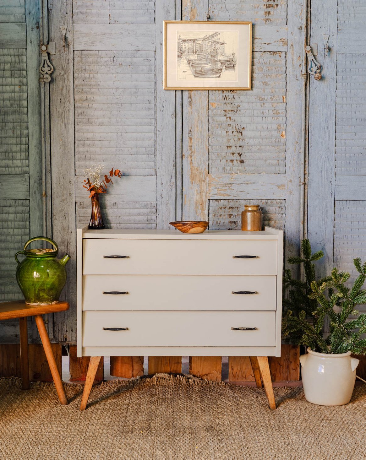 Apportez une touche de douceur avec cette commode en bois peinte en beige, reposant sur des pieds qui allègent ses lignes. Sa silhouette et ses proportions pensées pour les petits espaces offrent un rangement discret pour le linge, la vaisselle ou les accessoires, tandis que la finition mate souligne la chaleur naturelle du bois. Idéale dans une chambre ou une entrée, elle installe une ambiance calme et épurée, facile à intégrer dans une décoration contemporaine.