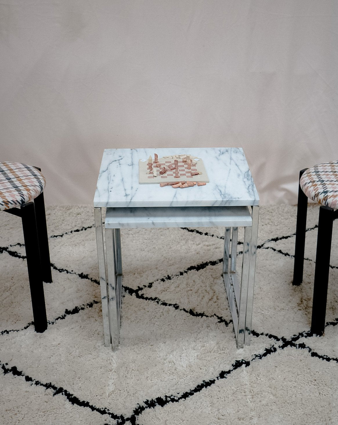 Sublimez votre intérieur avec cette paire de tables gigognes en marbre blanc et gris, associant la noblesse de la pierre à la finesse d'un piètement en métal chromé; le contraste de matières crée une esthétique élégante et contemporaine. Le décalage de hauteur et les proportions compactes permettent un usage modulable comme plateau d'appoint, bout de canapé ou table d'appoint dans une entrée, apportant lumière et structure à la pièce. Un point de rouille discret sur un pied en métal.