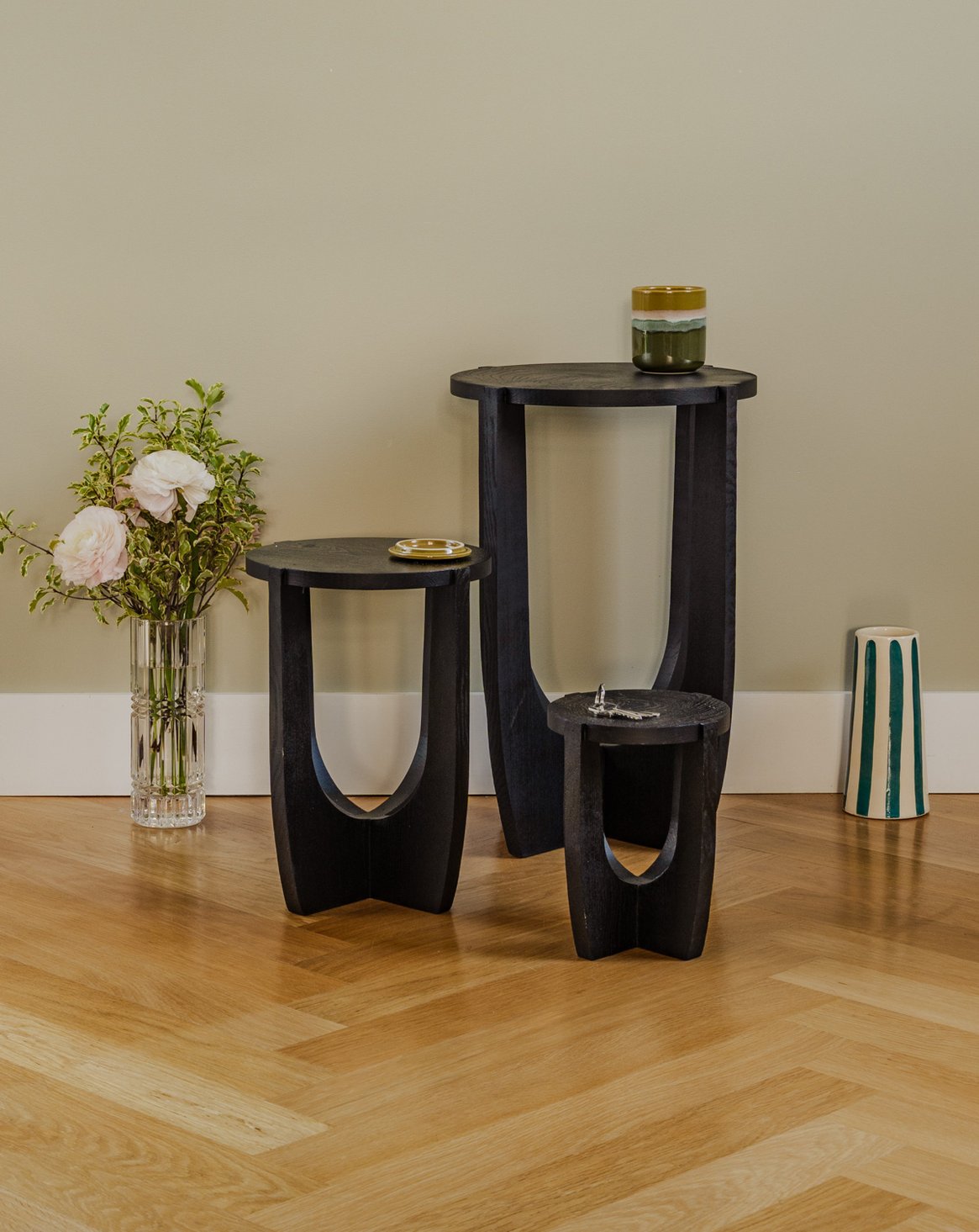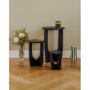 Adoptez ces trois tables d'appoint en bois noir, déclinées en petites, moyennes et grandes proportions pour jouer sur les effets d'échelle. Leur finition sombre et la chaleur du bois apportent une silhouette graphique et contemporaine, idéale en bout de canapé, chevet ou présentoir pour objets et plantes. Légères et facilement déplaçables, elles structurent l'espace sans l'alourdir et conviennent à un intérieur moderne et épuré. Quelques traces d'usage présentes.