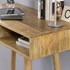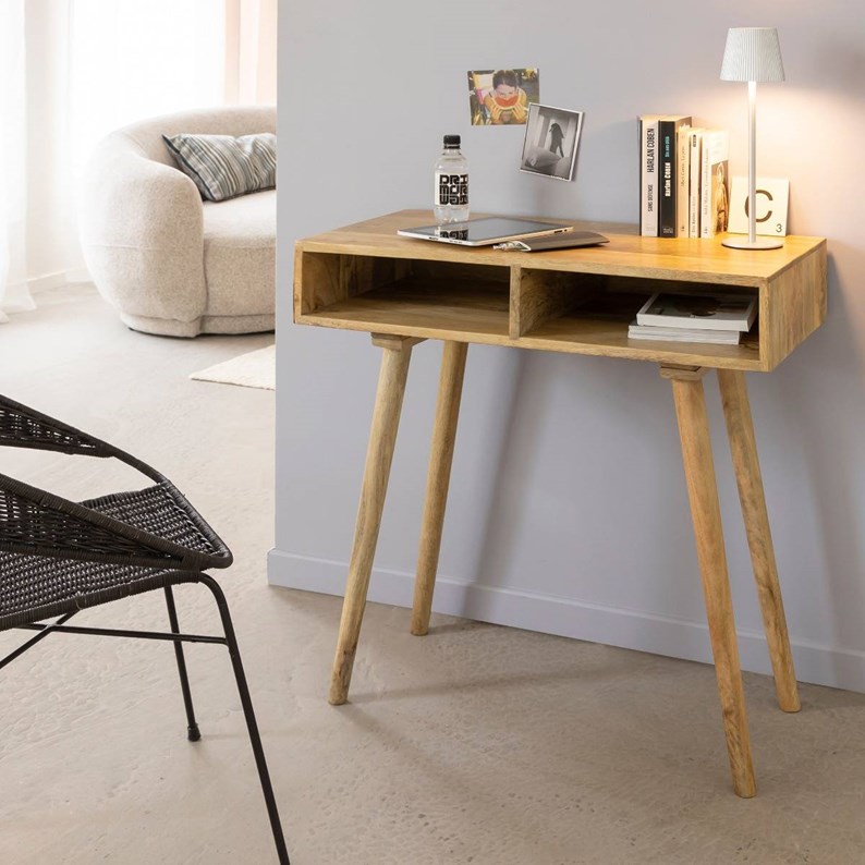 Console en bois de manguier Maeva. Idéale pour une entrée ou un couloir grâce à son format compact. Deux niches ouvertes pour un rangement pratique. Piétement effilé à monter. Collection Maëva.