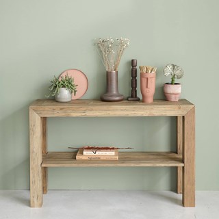 Pour accueillir vos objets de décorations, vos fleurs ou votre vide-poche, cette console en bois de teck recyclé sera parfaite dans votre salon ou dans votre entrée. Caractéristiques : Matière : Teck recyclé - Couleur : Naturel - Hauteur : 75 cm - Longueur : 120 cm - Profondeur : 35 cm - Poids : 27 kg - Garantie : 2 ans - Montage : Pieds et étagère à monter. Les + : étagère – teck recyclé.