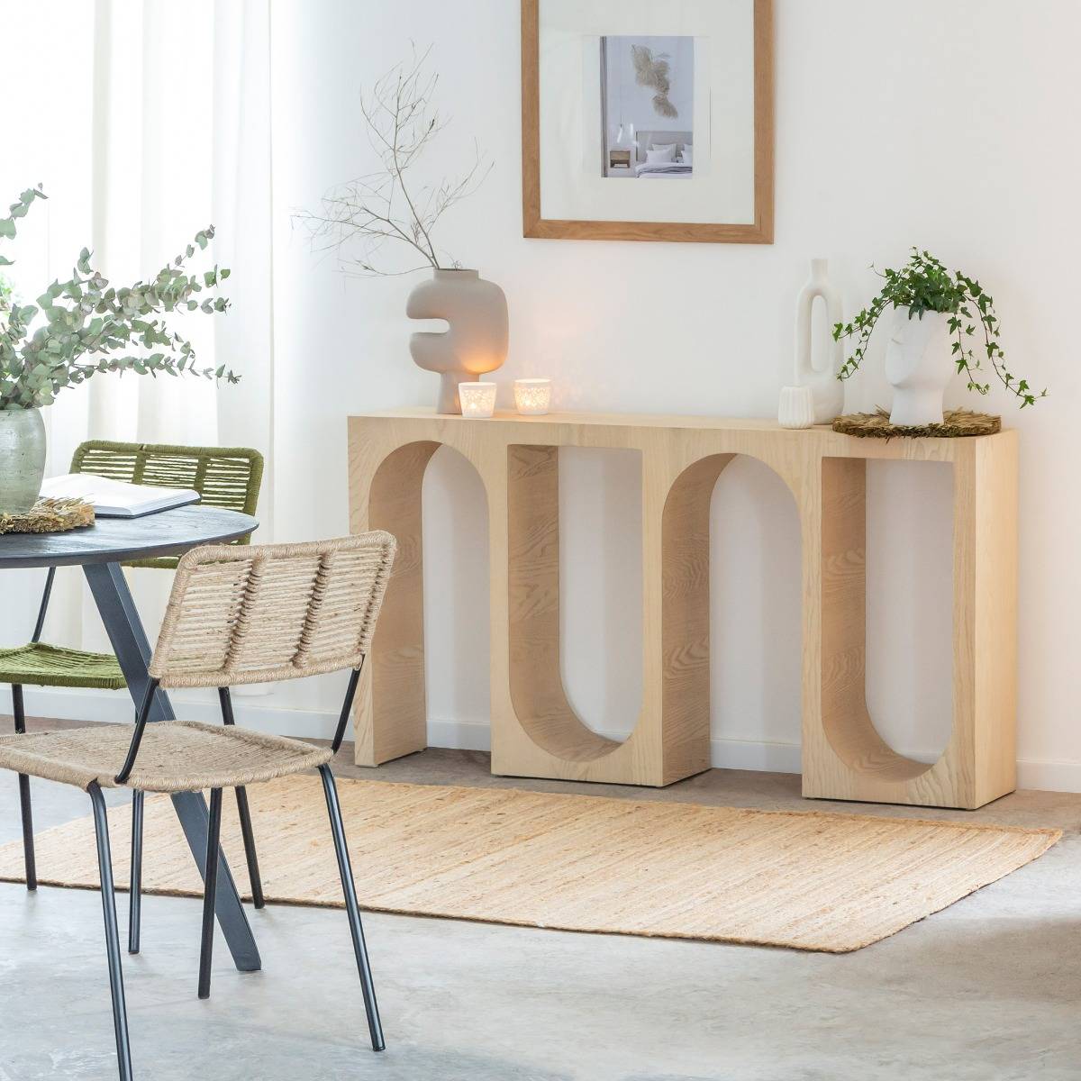 Console Octave : élégance intemporelle en bois de chêne. Dimensions : H75 cm, L140 cm. Robuste et naturel, s'adapte à tout style. Plateau lisse pour décor dynamique. Un ajout merveilleux à votre maison.
