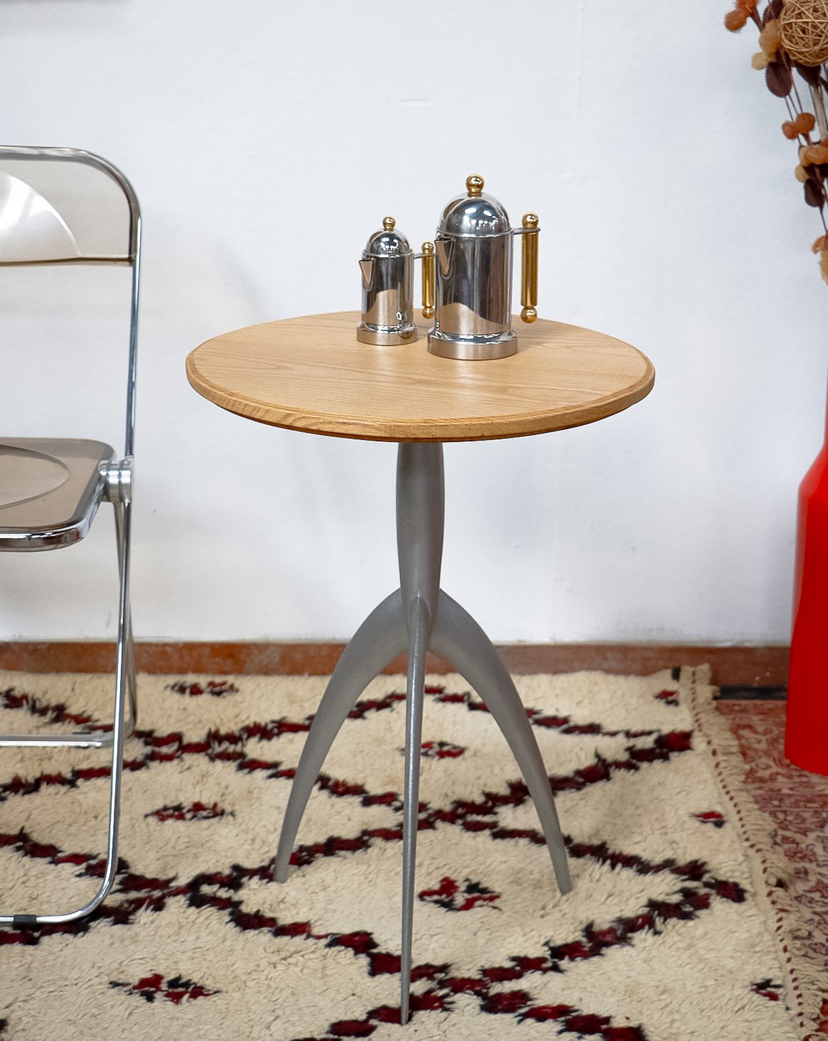 Adoptez ce guéridon Jolly signé Marc Berthier pour Magis, expression du design italien sobre et contemporain. Le piètement en aluminium offre une assise graphique et légère, tandis que le plateau en chêne massif, remonté ultérieurement, apporte une chaleur tactile et un contraste noble de matières. Au gabarit contenu et stable, il se glisse en bout de canapé, table d'appoint ou coin lecture, offrant une surface accueillante pour une lampe ou un livre et instaurant une atmosphère moderne et chaleureuse.