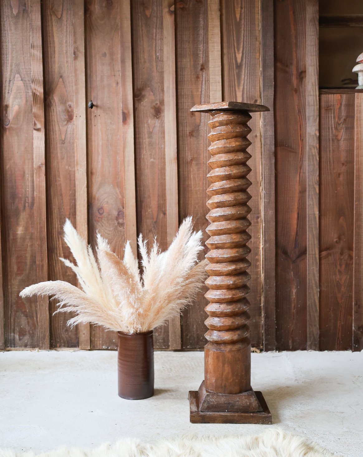 Sublimez votre intérieur avec cette sellette en chêne sculpté, teintée d'une patine bois foncé qui lui confère une présence chaleureuse et discrète. Sa silhouette élancée et son plateau compact, d'une épaisseur rassurante, offrent un support stable pour un vase, une lampe ou une plante, sans encombrer l'espace. Les colonnes évoquant les vis de pressoir révèlent un travail manuel et une allure sculpturale, idéale pour introduire une note d'authenticité et de raffinement dans une pièce contemporaine ou classique.