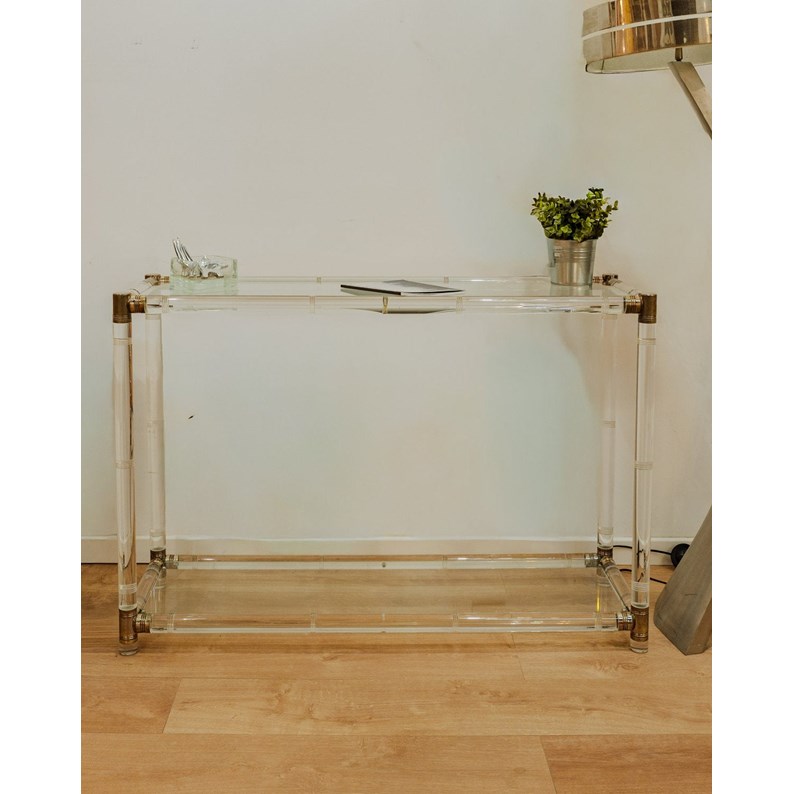 Sublimez votre entrée ou votre salon avec cette console en verre et plexiglass aux lignes épurées, ponctuée de détails métalliques raffinés. Ses deux plateaux en verre offrent un double niveau d'exposition pour livres, plantes et objets décoratifs, tandis que la transparence des matériaux apporte légèreté et jeu de reflets dans la pièce. Idéale pour les intérieurs contemporains ou minimalistes, elle structure discrètement l'espace sans l'alourdir, créant une atmosphère lumineuse et sobre. Quelques traces du temps.