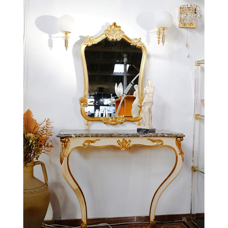 Sublimez votre intérieur avec cette console et son miroir esprit Louis XV, modèle italien des années 60, qui marie un plateau en marbre gris noir à une silhouette élégante et délicatement rétro. Pensée pour être fixée au mur, l'ensemble crée un point d'appui raffiné dans une entrée ou une chambre, offrant un plateau généreux pour objets décoratifs ou essentiels et un miroir qui structure l'espace avec grâce. Légères traces du temps sur le plateau qui participent à son charme.