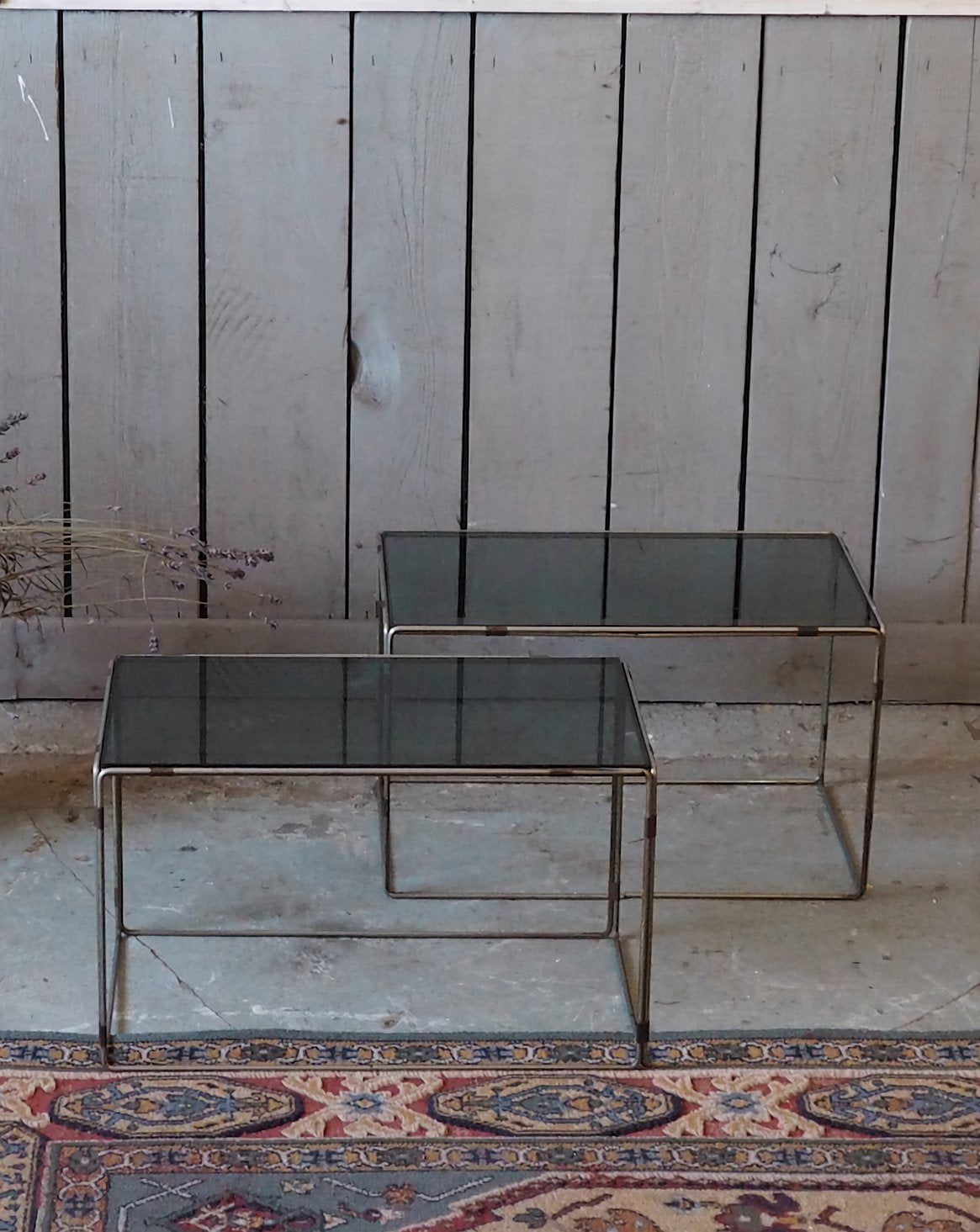 Découvrez cette paire de tables d'appoint en verre fumé bleu, au design épuré qui apporte une touche contemporaine et lumineuse à votre salon. Leur format bas et compact crée un ensemble modulable, parfait pour poser magazines, lampes et objets décoratifs tout en conservant une élégante légèreté visuelle. Le verre teinté sublime les reflets et structure l'espace avec sobriété, adapté tant aux intérieurs minimalistes qu'aux ambiances plus feutrées. Une table présente une partie oxydée et une liaison dessoudée.
