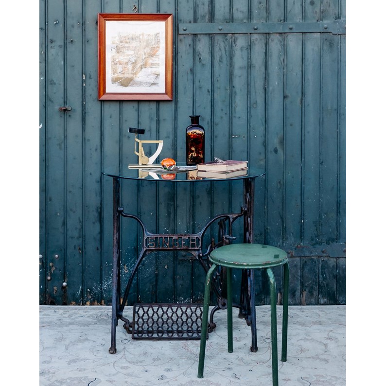 Apportez une note vintage et lumineuse avec cette table Singer à bascule, dotée d'un plateau en verre transparent posé sur une structure métallique aux lignes aériennes. Son format compact et son mécanisme à bascule en font une pièce multifonction : table d'appoint dans un salon, console fine pour une entrée ou support original pour une lampe et des objets déco. Le contraste verre-métal crée une ambiance industrielle chic et épurée. Quelques marques d'usure.