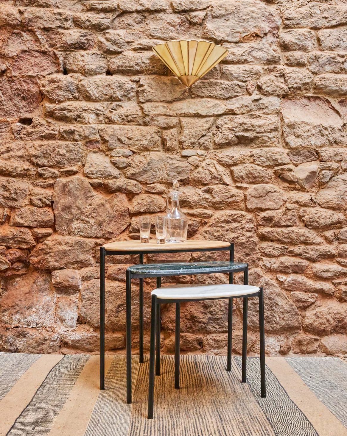 Sublimez votre salon avec ces trois tables gigognes mêlant la chaleur d'un plateau en bois et la fraîcheur du marbre vert et blanc. Aux formes ovales et aux proportions équilibrées, une grande table en bois, une moyenne en marbre vert, une petite en marbre blanc elles se lovent pour un gain de place ou se déploient en surfaces d'appoint pour lampes, livres et objets décoratifs. Le contraste des matières crée une ambiance raffinée et contemporaine, idéale pour composer un salon vivant et élégant.