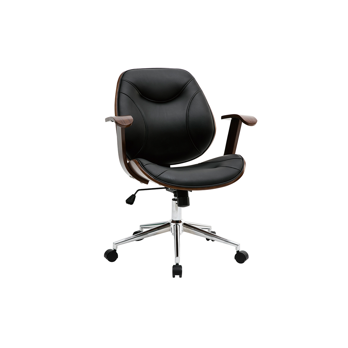 Chaise de bureau à roulettes design noir, bois foncé noyer et acier chromé YORKE livrée prête à assembler.