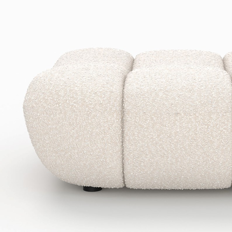 Cet ensemble fauteuil et pouf en tissu bouclé blanc se transforme en un clin d’œil en chaise longue généreuse. Design tout en rondeur, tissu doux et résistant : parfait pour un intérieur cosy et moderne.