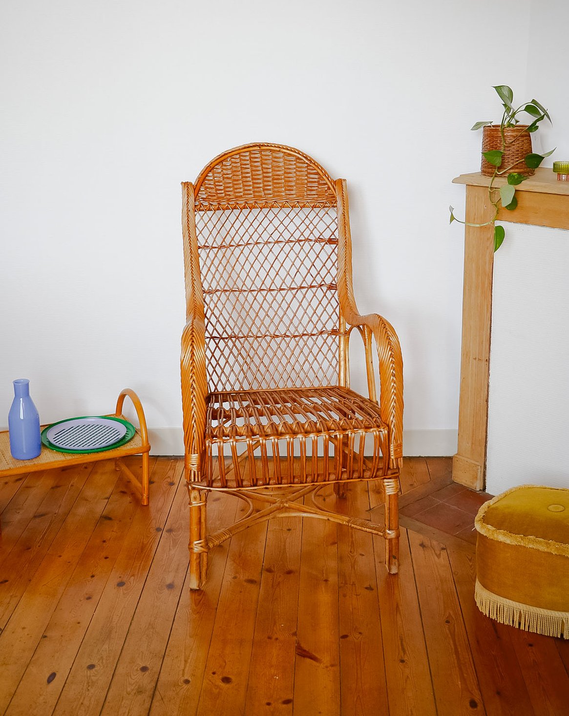 Adoptez ce fauteuil en rotin et bois foncé au gabarit élancé, dont la structure haute et l'assise profonde invitent à la détente avec une élégance naturelle. Le rotin tressé apporte chaleur et caractère, idéal pour un coin lecture ou une véranda lumineuse. Un manque de rotin sur l'un des pieds n'affecte pas sa solidité et souligne son histoire.